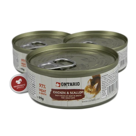 ONTARIO konzerva Chicken Pieces & Scallop je lahodná mäsová konzerva pre dospelé mačky. Obsahuje kuracie mäso, morské plody a vývar.