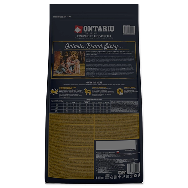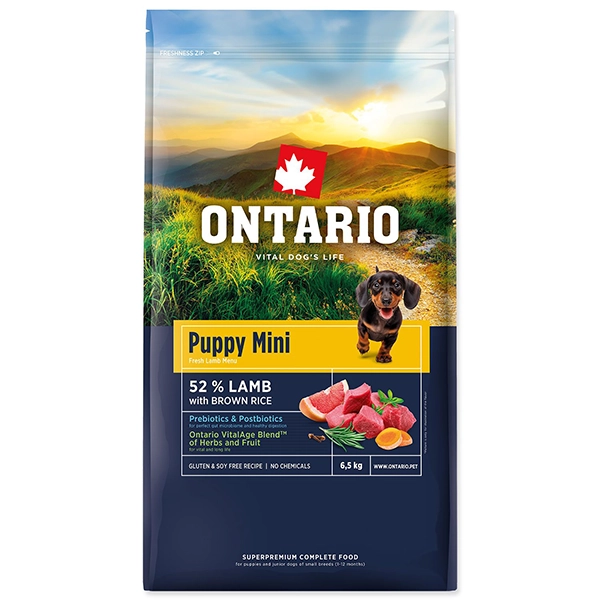 Ontario Puppy Mini Lamb & Brown Rice je superprémiové krmivo pre šteňatá a juniorov malých plemien s vysokým podielom kvalitného jahňacieho mäsa, hnedej ryže a funkčných zložiek. Podporuje vitalitu, trávenie, kĺby a imunitu. Bez zbytočnej chémie.