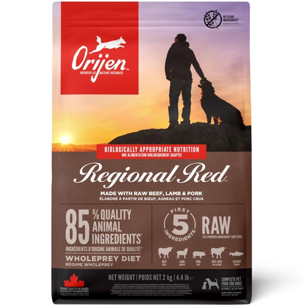 Orijen Dog Regional Red je krmivo vhodné pre psy všetkých plemien i veku. Obsahuje hovädzie, jahňacie a tradičné kanadské bravčové mäso.