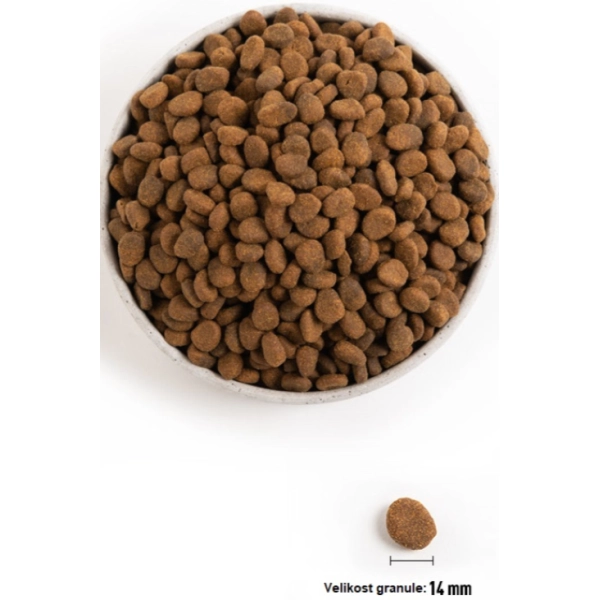Hrubý proteín 38 %, obsah tuku 18 %, hrubý popol 9 %, hrubá vláknina 5 %, vlhkosť 12 %, vápnik 1,8 %, fosfor 1,2 %, omega-6 mastné kyseliny 1,5 %, omega-3 mastné kyseliny 1 %, DHA/EPA 0,3 %.