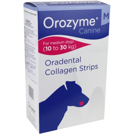Orozyme enzymatické žuvacie plátky pre psov od 10 do 30 kg (veľ. M) obsahujú prírodné enzýmy s antibakteriálnym účinkom. Ich žuvanie prispieva k čisteniu zubov, k odstraňovaniu zubného plaku a k odstráneniu nepríjemného zápachu z dutiny ústnej.