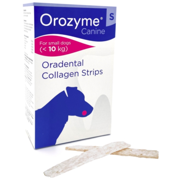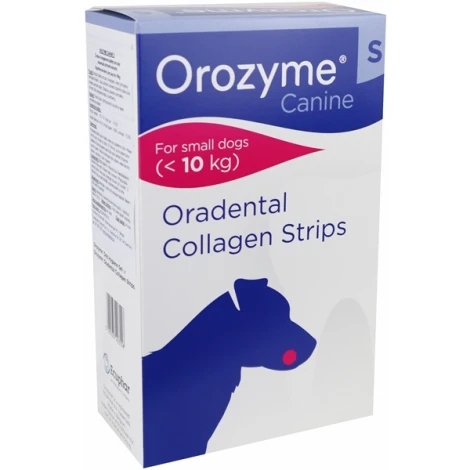 Orozyme enzymatické žuvacie plátky pre psy do 10 kg (veľkosť S) obsahujú prírodné enzýmy s antibakteriálnym účinkom. Vďaka prítomnosti enzýmov a intenzívnemu mechanickému čistiacemu efektu dochádza žuvaním plátkov k odstráneniu zubného povlaku, čím nedochádza k tvorbe zubného kameňa a následným zápalom v dutine ústnej. Orozyme plátky zabraňujú množeniu zubných baktérií a pomáhajú proti nepríjemnému zápachu z ústnej dutiny. Vhodné pre malé psy do 10 kg váhy.