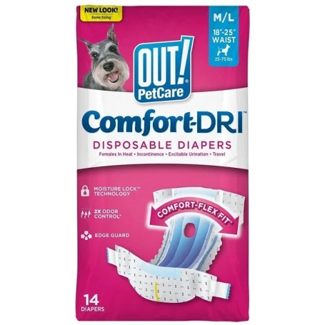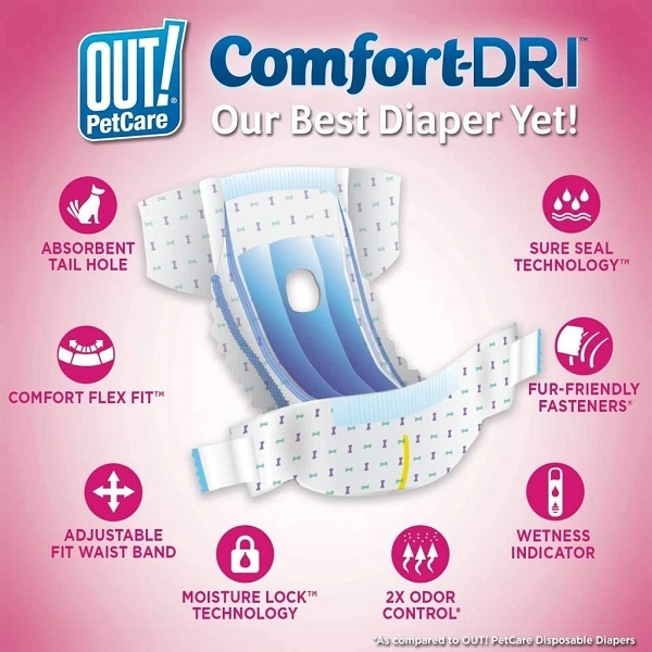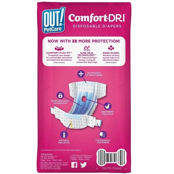 OUT! jednorazové plienky navrhnuté špeciálne pre sučky. Zapínanie plienky je flexibilné a teda drží plienku na mieste bez vytrhávania a zlepovania srsti. A vďaka indikátoru vlhkosti budete presne vedieť, kedy plienku vymeniť!