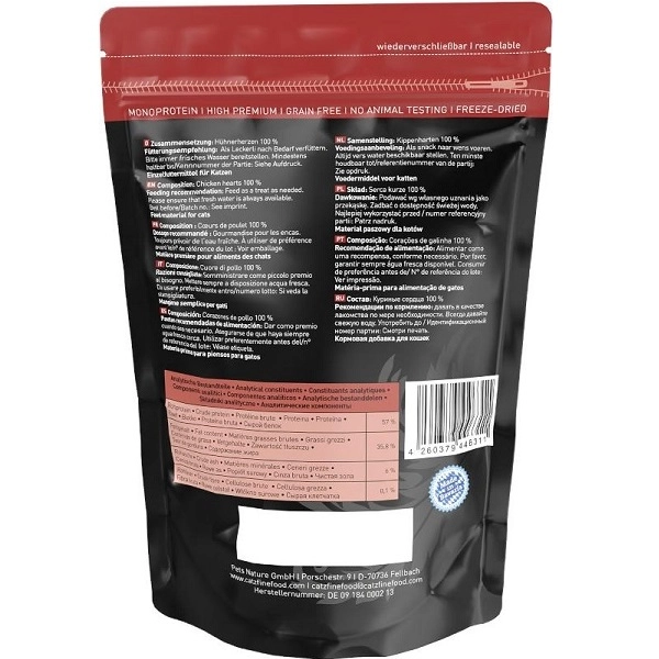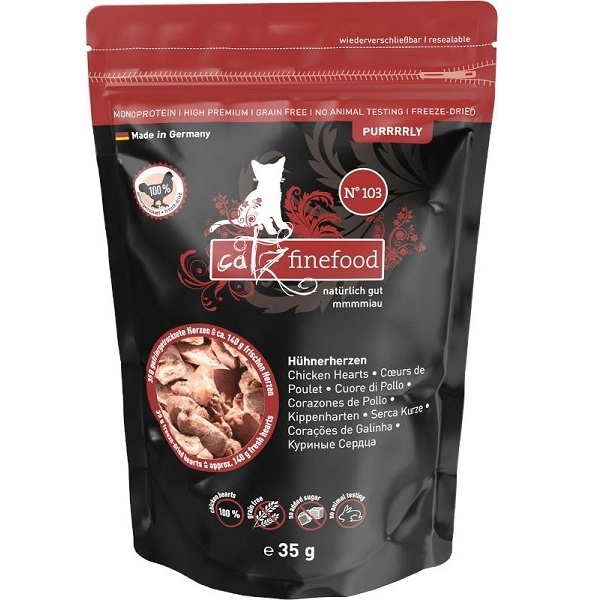 Čisto prírodné maškrty pre mačky zo sušeného mäsa Catz finefood Purrrrly. Vhodné aj pre alergické chlpáčalebo tie so špeciálnou diétou. Intenzívna chuť a arómu kuracích srdiečok si zamiluje každá!