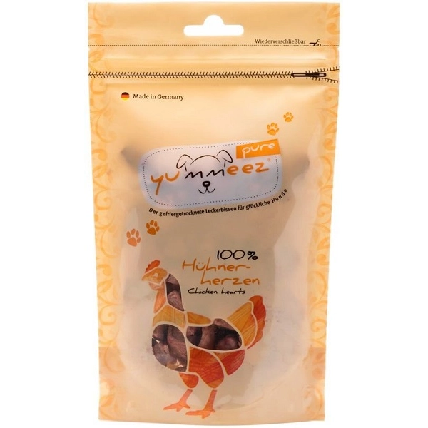 Čisto prírodný kúsky zo 100% sušeného mäsa Yummeez Pure. Výraznú arómu a chuť kuracích srdiečok neodmietne ani najväčší labužník. Skvelá motivácia pre výcvik. Dobroty neobsahujú žiadne prímesi, a preto sú vhodné aj pre psíkov s potravinovými alergiami alebo s citlivým zažívaním.