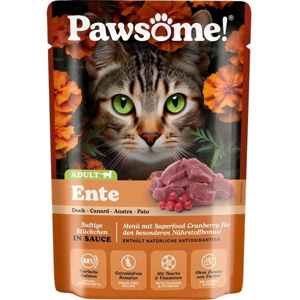 Kapsička Pawsome! pre dospelé mačky s kačacím mäsom ponúka mačkám jedinečný chuťový zážitok a vyvážený pomer bielkovín, tukov, vitamínov a minerálov pre aktívny a šťastný život plný dobrodružstiev. Jemná kombinácia šťavnatých kúskov s kačacím mäsom a brusnicami v lahodnej omáčke uspokojí každý apetít a prispeje k celkovému zdraviu a vitalite vašej mačky.