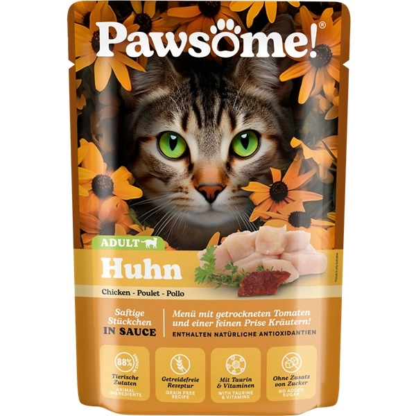 Kapsička Pawsome! pre mačky Adult s kuracím mäsom ponúka mačkám jedinečný chuťový zážitok a vyvážený pomer bielkovín, tukov, vitamínov a minerálov pre aktívny a šťastný život plný dobrodružstiev. Jemná kombinácia šťavnatých kúskov s kuracím mäsom, paradajkami, tymiánom a petržlenom v lahodnej omáčke uspokojí každý apetít a prispeje k celkovému zdraviu a vitalite vašej mačky.