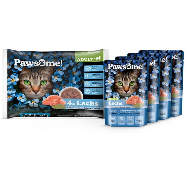 Kapsička Pawsome! pre mačky Adult s lososom ponúka mačkám jedinečný chuťový zážitok a vyvážený pomer bielkovín, tukov, vitamínov a minerálov pre aktívny a šťastný život plný dobrodružstiev. Jemná kombinácia šťavnatých kúskov lososa a kuracieho mäsa so spirulinou v lahodnej omáčke uspokojí každý apetít a prispeje k celkovému zdraviu a vitalite vašej mačky.