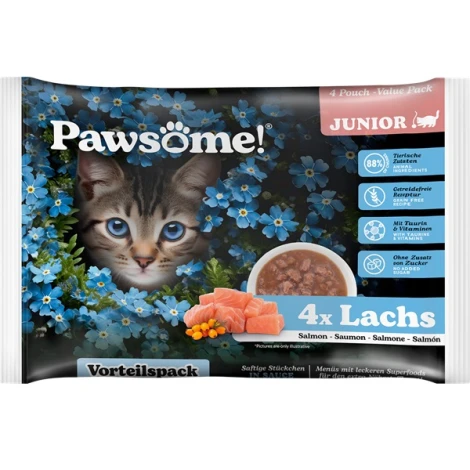 Kapsička Pawsome! Junior s lososom pre mladé mačky do 12 mesiacov veku dodá vášmu mačiatku potrebné živiny pre zdravý rast a vývoj. Jemná chuť a vôňa kapsičky so šťavnatými kúskami s lososom a rakytníkom v lahodnej omáčke poteší aj tých najmaškrtnejších domácich miláčikov. Bez obilnín a pridaného cukru. Balenie obsahuje 4 kapsičky.