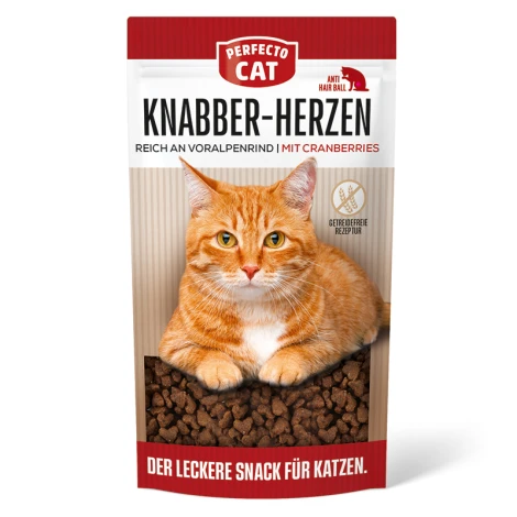 Maškrty pre mačky Perfecto Cat Anti Hairball Hearts s alpským hovädzím mäsom a brusnicami, tiež s Anti Hairball účinkom. Tieto chrumkavé odmeny v tvare srdiečok ľahko spestria stravu každej dospelej mačky. Doplnkové krmivo bez obsahu obilnín.