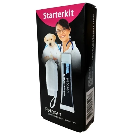 Štartovacia sada na dentálnu hygienu Petosan. Sada obsahuje zubnú pastu 20 g s kuracou príchuťou a zubnú kefku na prst z mikrovlákna s antibakteriálnou úpravou. Sada Petosan slúži k jednoduchému a efektívnemu čisteniu v domácom prostredí, odstraňuje zubný kameň a plak.