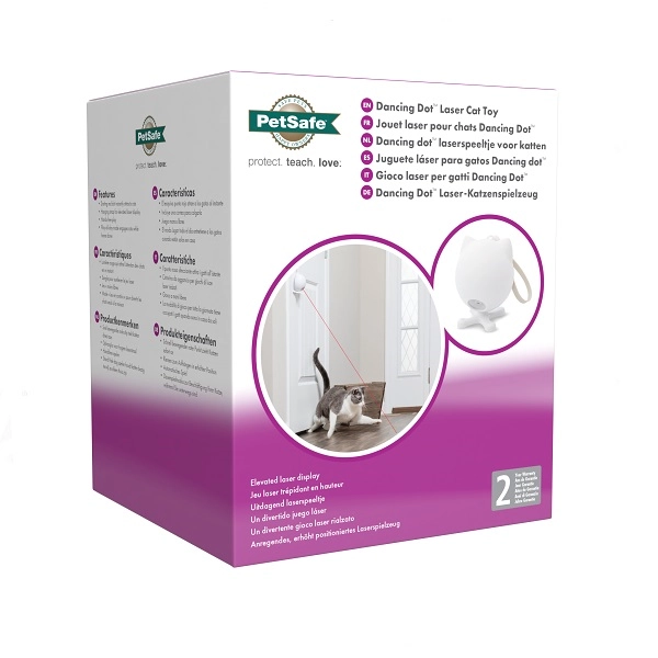 Pútavá hračka pre mačky PetSafe Dancing Dot. Náhodné vzory a pohyby lasera udržujú vašu mačku v napätí a zaujatí tým, že stimulujú jej prirodzené inštinkty prenasledovania, stopovania a vrhania sa.