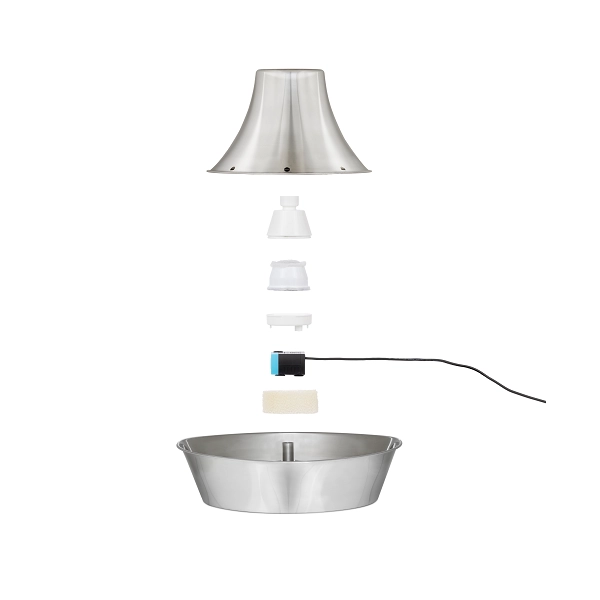 Keď je čas fontánu vyčistiť, umiestnite nerezovú vežu a misku na hornú poličku umývačky riadu a ručne vyčistite čerpadlo.