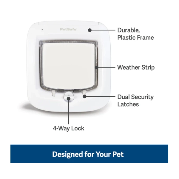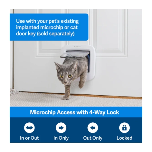 Pomocou pohodlného 4 smerného manuálneho zamykania je možné pohodlne kontrolovať prístup a pohyb naprogramovaných mikročipov u vašich zvierat. PetSafe Smart dvierka s mikročipom čítajú najbežnejší typ mikročipu DX-B (15 číslic). Dvierka PetSafe sú vhodné do drevených, PVC a kovových dverí a taktiež do murovaných stien, do sklenených okien a dverí.