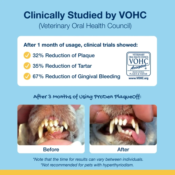 PlaqueOff ™ Powder je prelomový prostriedok v starostlivosti o zuby a ďasná psov a mačiek. Významne obmedzuje zubný plak a zubný kameň a odstraňuje zápach z papule. Prípravok je vo forme prášku a preto sa ľahko pridáva do bežnej potravy.