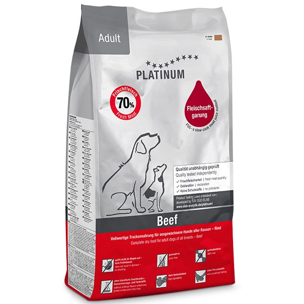 Platinum Natural Adult s hovädzím so zemiakmi je superprémiové krmivo s nulovým obsahom obilnín, vhodné pre dospelých psov stredných a veľkých plemien. Vďaka svojmu prírodnému a jednoduchému zloženiu je ľahko stráviteľné. Vyhovuje nutričným požiadavkám psov s citlivým zažívaním a problematickou črevnou mikroflórou. Zvyšuje imunitu a rieši rôzne potravinové intolerancie. Je vhodné aj pre aktívnych starších psov.