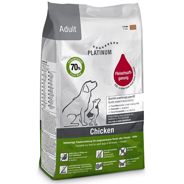 Platinum Natural Adult Chicken je polomäkké krmivo s vysokým obsahom kuracieho mäsa. Je vhodné pre dospelých psov všetkých plemien aj jedincov s vysokou fyzickou záťažou. Umožňuje psom dosahovať maximálneho možného rozvoja kondície, predovšetkým sily a rýchlosti.