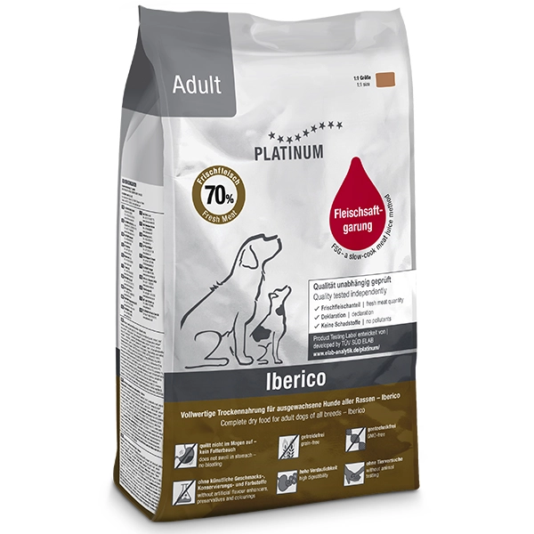 Platinum Natural Adult Iberico je superprémiové krmivo s nulovým obsahom obilnín, vhodné pre dospelých psov všetkých plemien. Vďaka svojmu prírodnému a jednoduchému zloženiu je ľahko stráviteľné a pochutnajú si na ňom aj psíci s alergiami na iné druhy mäsa. Iberské mäso je jedným z najkvalitnejších, je šťavnaté a výživné, a psy jeho chuť zbožňujú. Pyrenejské ošípané sú krížencami domáceho a divokého prasaťa, čo dáva mäsu unikátnu chuť, ktorá kombinuje zverinu a bravčové. Krmivo je vhodné aj pre aktívnych starších psov.