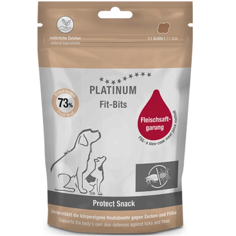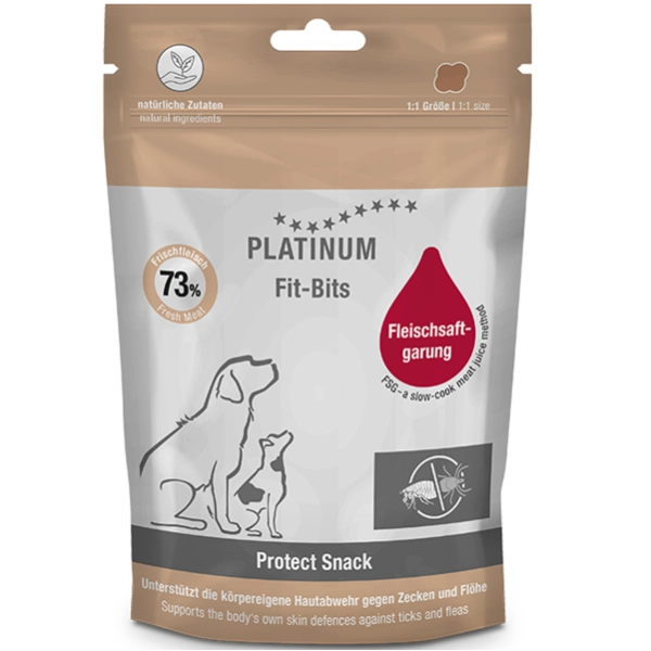 Pochúťky pre psov Platinum Natural Fit Bits Protect s čerstvým mäsom, šípkami, rascovým olejom a rozmarínom prirodzeným spôsobom podporia vašu vlastnú obranu proti kliešťom a blchám.Pokožka psa sa vďaka kombinácii ochranných bylín, semien a olejov stane pre kliešte a blchy neatraktívna, čím sa zníži riziko infekcie. Príprava maškŕt spočíva v dlhodobom varení čerstvého mäsa výlučne vo vlastnej mäsovej šťave pri nízkej teplote, čím zostáva nutrične veľmi bohaté.