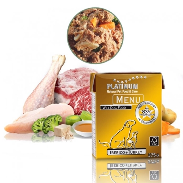 Pomaly varená paštéta z bravčového a hydinového mäsa Platinum Natural Menu je neodolateľnou pochúťkou pre všetkých psích labužníkov. Je vyrobená z prírodných surovín, obsahuje 83 % čerstvého mäsa a je bohatá na živiny a vitamíny. Vďaka šetrnej príprave metódou Fleischsaftgarung si mäso zachováva svoju bohatú chuť a vôňu. Paštéta je kompletné, vyvážené krmivo, ktoré možno podávať ako hlavné menu alebo len ako prílohu ku granulám.