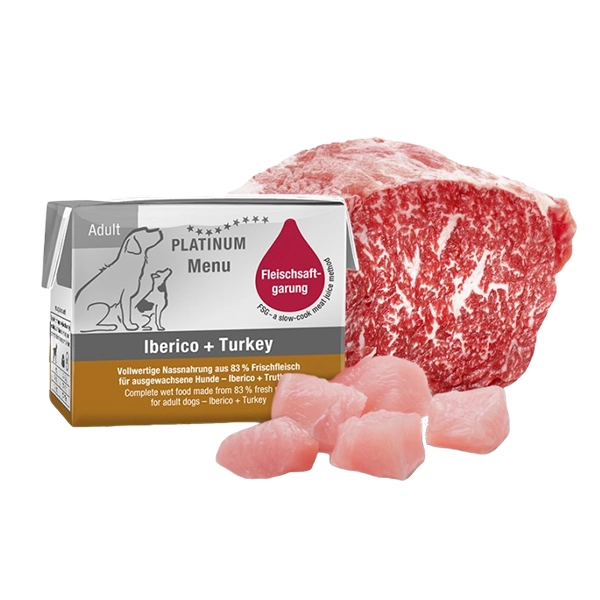 Pomaly varená paštéta z bravčového a hydinového mäsa Platinum Natural Menu je neodolateľnou pochúťkou pre všetkých psích labužníkov. Je vyrobená z prírodných surovín, obsahuje 83 % čerstvého mäsa a je bohatá na živiny a vitamíny. Vďaka šetrnej príprave metódou Fleischsaftgarung si mäso zachováva svoju bohatú chuť a vôňu. Paštéta je kompletné, vyvážené krmivo, ktoré možno podávať ako hlavné menu alebo len ako prílohu ku granulám.