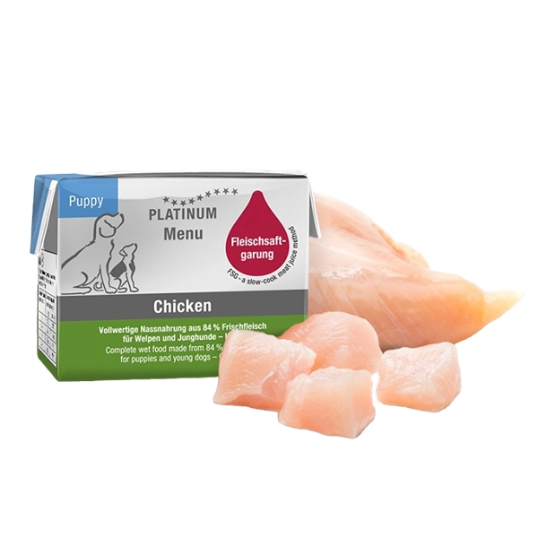 Platinum Natural Menu Puppy pomaly varená kuracia paštéta je neodolateľná pochúťka pre všetky šteňatá. Je vyrobená z prírodných surovín, obsahuje 84 % čerstvého kuracieho mäsa a je bohatá na živiny, vitamíny. Receptúra je bezlepková a hypoalergénna. Vďaka šetrnej príprave metódou Fleischsaftgarung si mäso navyše zachováva svoju bohatú chuť a vôňu. Paštéta je kompletné vyvážené krmivo, ktoré možno podávať ako hlavné menu alebo len ako doplnok ku granulám.