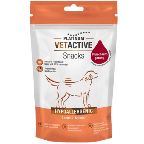 Vysoký podiel čerstvého mäsa a starostlivo vybrané ingrediencie vytvárajú chutnú a hypoalergénnu pochúťku, ktorá je obzvlášť vhodná pre psov s potravinovými alergiami a intoleranciami. Hypoalergénne pochúťky Platinum Vetactive Snack s čerstvým lososom, zemiakmi, zeleninou s vysokým obsahom vlákniny a lososovým olejom majú pozitívny vplyv na zdravie a sú vhodné pre psích labužníkov všetkých veľkostí.