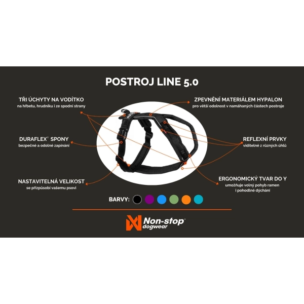 Non-stop Line 5.0 je univerzálny krátky postroj, ktorý neobmedzuje pohyb psa. Preto je vhodný aj na dlhšie výlety, dogtrekking alebo psie športy. Všetky švy a okraje na vnútornej strane postroja sú ušité tak, aby hladká strana smerovala k telu psa. Vnútorná podšívka sa prekrýva bez tvrdých okrajov, aby sa zabránilo odieraniu. Postroje sú vyrobené z odolného pevne tkaného nylonu a majú penové polstrovanie s uzavretými pórmi, ktoré zabraňuje presakovaniu vody. Postroj Line 5.0 je na exponovaných miestach vyztužený Hypalonom.