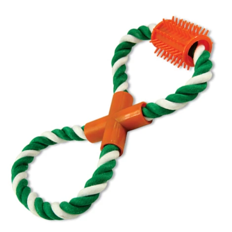 odstrániťInteraktívna hračka pre psov v tvare osmičky, podporujúca dentálnu hygienu. Veľkosť: 25 cm. Osmička je z bavlny, masážny valček z gumy.