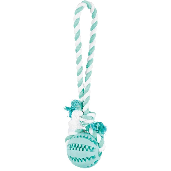 Preťahovadlo DENTAfun s loptou z prírodnej gumy. Vďaka tvaru loptičky si pes počas hrania čistí zuby, medzizubné priestory a tiež masíruje ďasná.To pôsobí preventívne proti vzniku zubného povlaku a kameňa. Výťažok z mäty osviežuje dych.