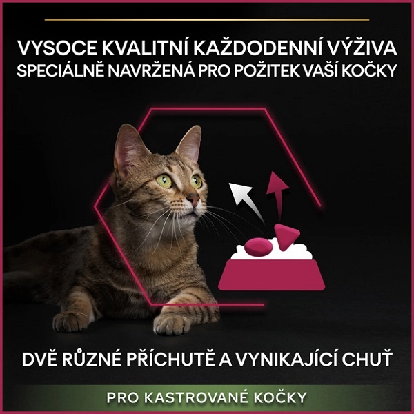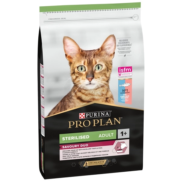 Pro Plan Cat Sterilised Savoury Duo Cod & Trout je kompletné krmivo špeciálne navrhnuté pre kastrované mačky, ktoré majú vplyvom kastrácie sklon k nadváhe. Krmivo s treskou a pstruhom pomáha udržať ideálnu telesnú hmotnosť a zdravé fungovanie močových ciest a obličiek. Vysoké množstvo bielkovín, arginín, antioxidanty a omega-3 mastné kyseliny zaistia vašej mačičke skutočný chuťový pôžitok z kŕmenia.
