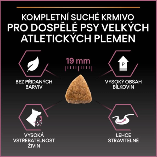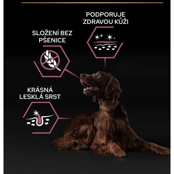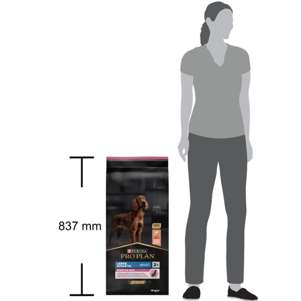 Receptúra granúl Pro Plan Large Adult Athletic Sensitive Skin pre dospelých psov veľkých plemien s atletickou postavou (s hmotnosťou nad 25 kg) obsahuje špeciálnu kombináciu živín, ktorá je ideálna pre psy s citlivou kožou a pomáha tak obmedziť kožné reakcie spojené s precitlivenosťou na krmivo. Hlavným zdrojom bielkovín sú kúsky kvalitného lososa, ktorý vďaka svojmu vysokému obsahu omega-3 mastných kyselín napomáha udržiavať zdravú kožu a lesklú srsť. Krmivo je úplne bez pšenice. Optimálnu výživu zaisťuje vysoký podiel vybraných bielkovín pre silné svaly, vitamín D a minerálne látky pre zdravé zuby a ďasná. Výhody krmiva radu Sensitive Skin prispievajú k ideálnej telesnej kondícii a každodennému zdraviu a pohodliu vášho psa.