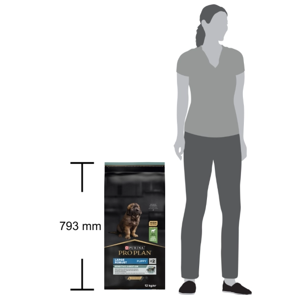Pro Plan Large Puppy Robust Sensitive Digestion s kúskami kvalitného jahňacieho je kompletné krmivo pre šteňatá veľkých robustných plemien (s hmotnosťou viac ako 25 kg v dospelosti) do 24 mesiacov veku, ktoré majú citlivé zažívanie. Jednotlivé zložky obsiahnuté v krmive sú vysoko stráviteľné, uľahčujú proces trávenia a nedráždia tráviaci trakt. Vysoký obsah bielkovín je doplnený o prebiotiká, ktoré zvyšujú množstvo prospešných bifidobaktérií a tým zlepšujú rovnováhu črevnej mikroflóry, bentonit (prírodný íl) pre zdravé vyprázdňovanie, vitamín D a minerálne látky pre silné a zdravé zuby. Krmivo radu Sensitive Digestion zaistí skvelú kondíciu, optimálnu výživu a každodenné zdravie. Vhodné aj pre gravidné a dojčiace sučky.
