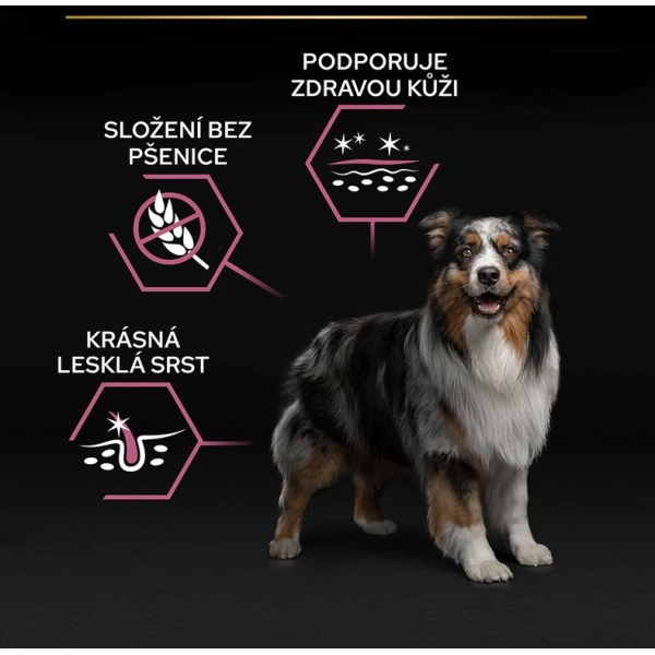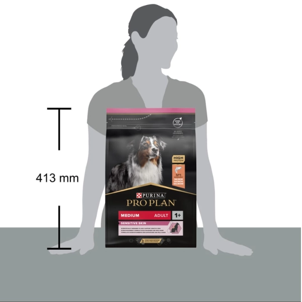 Receptúra granúl Pro Plan Medium Adult Sensitive Skin pre dospelých psov stredných plemien (s hmotnosťou 10-25 kg) obsahuje špeciálnu kombináciu živín, ktorá je ideálna pre psy s citlivou kožou a pomáha tak obmedziť kožné reakcie spojené s precitlivenosťou na krmivo. Hlavným zdrojom bielkovín sú kúsky kvalitného lososa, ktorý vďaka svojmu vysokému obsahu omega-3 mastných kyselín napomáha udržiavať zdravú kožu a lesklú srsť. Krmivo je úplne bez pšenice. Optimálnu výživu zaisťuje vysoký podiel vybraných bielkovín pre silné svaly, vitamín D a minerálne látky pre zdravé zuby a ďasná. Výhody krmiva radu Sensitive Skin prispievajú k ideálnej telesnej kondícii a každodennému zdraviu a pohodliu vášho psa.