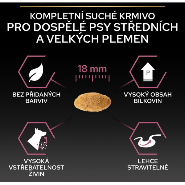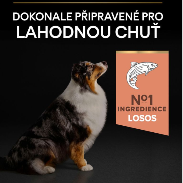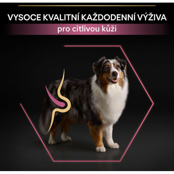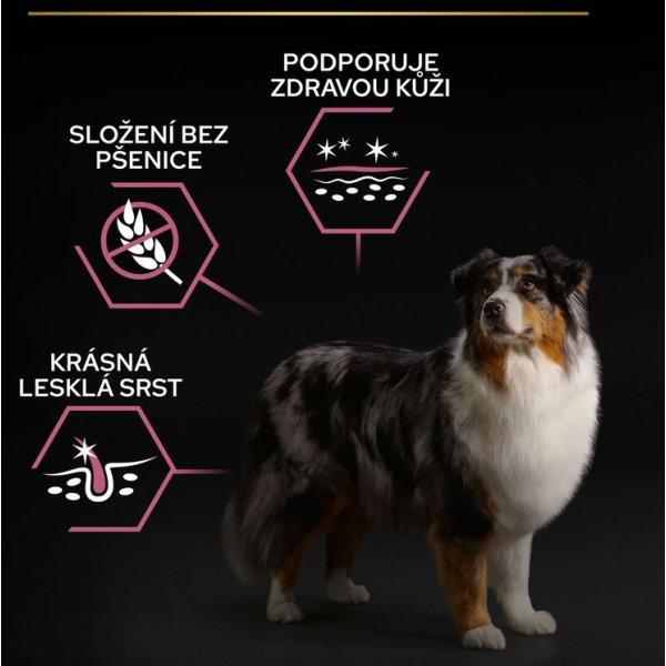 Receptúra granúl Pro Plan Medium & Large Adult 7+ Sensitive Skin pre psy stredných a veľkých plemien starších ako 7 rokov (s hmotnosťou nad 10 kg) obsahuje špeciálnu kombináciu živín, ktorá je ideálna pre psy s citlivou kožou a pomáha tak obmedziť kožné reakcie spojené s precitlivenosťou na krmivo. Hlavným zdrojom bielkovín sú kúsky kvalitného lososa, ktorý vďaka svojmu vysokému obsahu omega-3 mastných kyselín napomáha udržiavať zdravú kožu, lesklú srsť a zdravé kĺby. Krmivo je úplne bez pšenice. Optimálnu výživu pre zdravé starnutie zaisťujú vybrané zdroje bielkovín, vitamín D a minerálne látky pre zdravé zuby a ďasná. Vyvážený pomer bielkovín a tukov prispieva k udržaniu optimálnej váhy a každodennému zdraviu a pohodliu vášho psa.