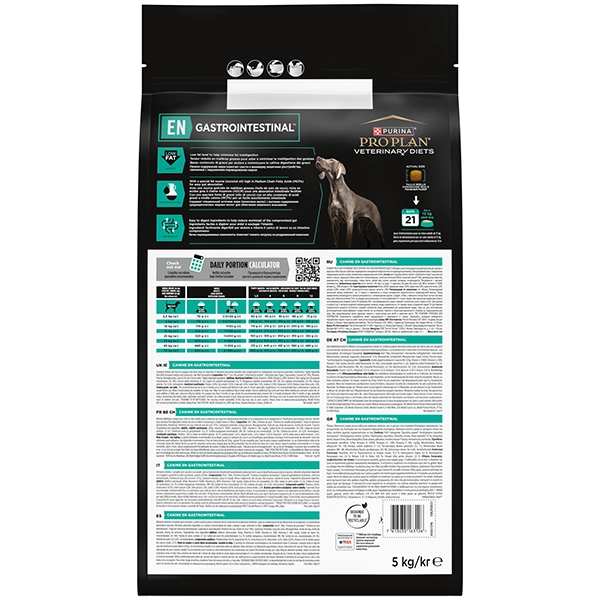 Veterinárna diéta Pro Plan Canine EN Gastrointestinal je kompletné krmivo pre psov všetkých vekových kategórií, ktorí trpia ochorením tráviaceho traktu alebo exokrinnou pankreatickou nedostatočnosťou. Krmivo uľahčuje trávenie a zlepšuje mikrobiálnu rovnováhu v črevách. Môže pomôcť nutrične zvládnuť akútne a chronické gastrointestinálne ochorenia. Vyvážený obsah rozpustnej a nerozpustnej vlákniny podporuje správnu konzistenciu výkalov. Nízky obsah tukov pomáha znižovať množstvo nestráveného tuku. Obsahuje kokosový olej, s vysokou hladinou mastných kyselín so stredne dlhým reťazcom (MCFAs), ktorý je ľahko stráviteľným a využiteľným zdrojom energie. Vysoká stráviteľnosť uľahčuje dostupnosť živín, zvyšuje ich vstrebávanie a pomáha znižovať zápal postihnutého čreva. Krmivo je vyrobené z vysoko chutných surovín, vrátane špeciálne vybraných tukov, ktoré sú ľahko stráviteľné a vstrebateľné.