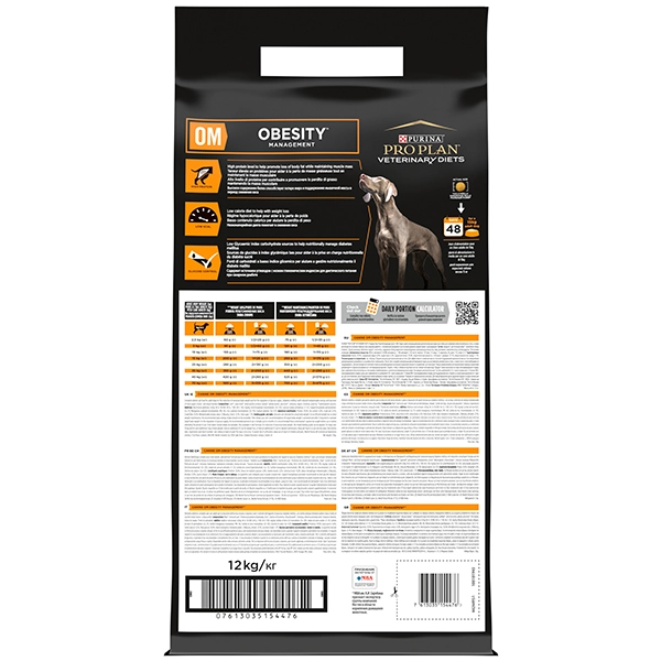 Veterinárne krmivo Pro Plan VD Canine OM Obesity Management je ideálne nutričné riešenie pre psov, ktorí potrebujú schudnúť a následne si udržať optimálnu hmotnosť. Zloženie je starostlivo zostavené tak, aby psovi dodalo vyváženú výživu a potrebné živiny v adekvátnom množstve. Nízky obsah kalórií napomáha chudnutiu. Vysoký obsah bielkovín počas chudnutia podporuje odbúravanie telesného tuku pri zachovaní svalovej hmoty. Cieľom zdravého chudnutia je, aby pes chudol 2 % súčasnej hmotnosti týždenne. Denná kŕmna dávka je tak potrebné každé 4 týždne upraviť.