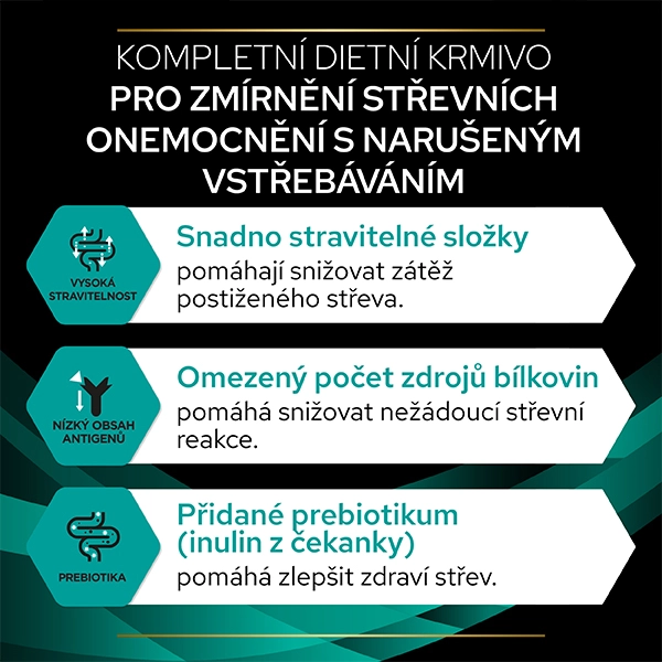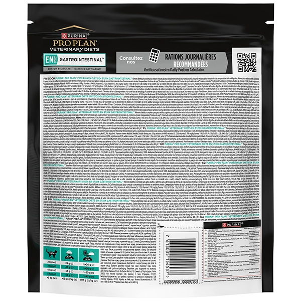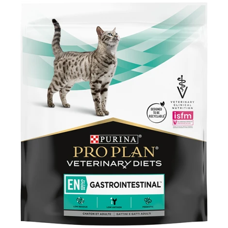 Pre Plan VD Feline EN Gastrointestinal je kompletné diétne veterinárne krmivo, určené na nutričnú terapiu ochorení tráviaceho traktu u mačiek všetkých vekových kategórií. Vysoko kvalitné a mimoriadne stráviteľné zložky krmiva pomáhajú znížiť záťaž tráviaceho traktu a urýchľujú jeho zotavovanie. Obsah vysoko stráviteľných zložiek a prebiotík v krmive podporujú celkové zdravie čriev a optimálne zloženie črevnej mikroflóry. Krmivo pomáha zmenšiť zaťaženie postihnutého čreva a obmedzený počet zdrojov bielkovín predchádza nepriaznivým reakciám na krmivo. Má zvýšený obsah sodíka a draslíka, vysokú koncentráciu energie a esenciálnych živín. Diéta dokonale spĺňa nutričné potreby mačiek s postihnutým črevom.