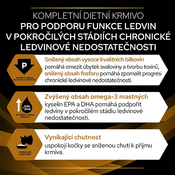 Pre Plan VD Feline NF Advanced Care je kompletné diétne krmivo pre mačky, určené na podporu obličkovej funkcie v prípade chronickej obličkovej nedostatočnosti. Diéta obsahuje znížené množstvo bielkovín vysokej kvality a znížený obsah fosforu.