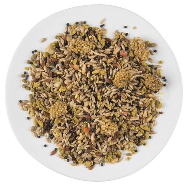 Semená (2 % proso, 2 % ľanové semeno, 2 % chia semeno), obilniny, vedľajšie produkty rastlinného pôvodu, minerálne látky, ovocie (1 % banán), oleje a tuky, zelenina, vajcia a vaječné výrobky (0,2 %).
