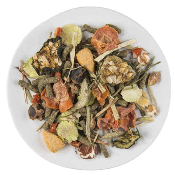 Vedľajšie rastlinné produkty (4 % seno z timotejsky lúčnej a 1 % oregáno), zelenina (5 % mrkva, 3 % uhorka a 2 % zeler), obilniny, oleje a tuky, minerálne látky.