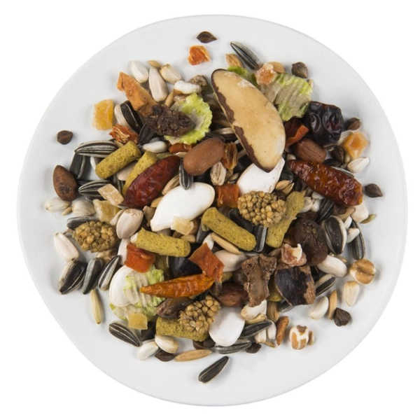 Semienka, obilniny, vedľajšie výrobky rastlinného pôvodu (1 % chilli papričiek), ovocie (2 % manga), orechy (2 % para orechov, 2 % píniových orieškov), zelenina, minerálne látky, oleje a tuky, vajcia a vaječné výrobky (0,3 %).