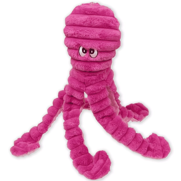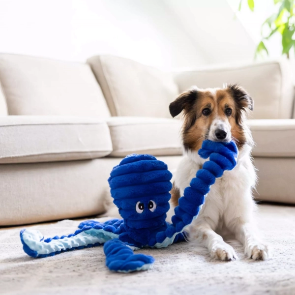 Obrovská plyšová chobotnica Quapas! objíme psa s nekonečnou dávkou zábavy. Päť šuštiacich chápadiel, vyzývavé pískatko a obrovská veľkosť ponúkajú nespočetné možnosti spoločnej hry, veselého žuvania a láskyplného maznania. Ideálna hračka pre stredne veľkých až veľkých chlpáčov.