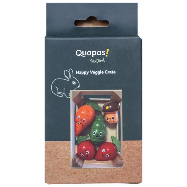 Drevená škatuľka s veselou zeleninou uspokojí prirodzenú túžbu hryzkať a žuť. Quapas! Veggie Crate je zábavná hračka pre králiky a hlodavce, ktorá im skráti čas. Povolené je úplne všetko - od okusovania a prestavovania až po zvedavé číhanie v snahe nájsť skryté pochúťky.