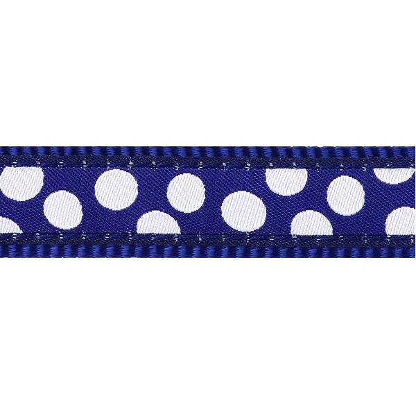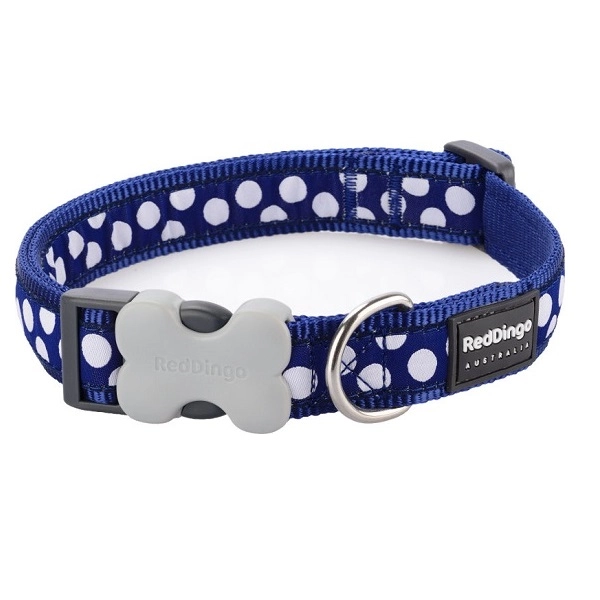 Rozkošný obojok Red Dingo v sýto modrej farbe s bielymi bodkami. Na prvý pohľad zaujme vtipná ale veľmi pevná karabína v tvare kosti. Obojky Red Dingo sú šité ručne priamo v Austrálii. Okraje sú husto tkané pre ešte väčšiu odolnosť voči oderu.