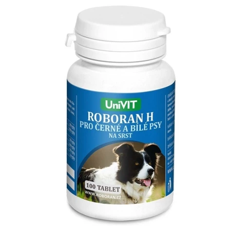 Doplnkové krmivo pre psov Roboran H vo forme tabliet. Používa sa pre zlepšenie kvality srsti a zvýšenie kontrastu farieb pri čiernych, bielo-čiernych a bielych psov, bez vzniku žltého a hnedého nádychu.