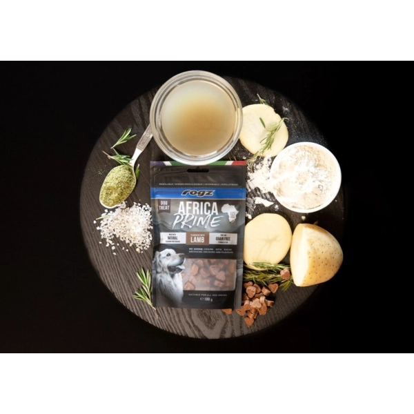 Kúsok radosti pre každého chlpatého priateľa - chutné, polomäkké a ľahko stráviteľné pochúťky Rogz Dog Treat Africa Prime Lamb z ďalekej Južnej Afriky. Hypoalergénna receptúra bez obilnín sa spolieha na hydinu, jahňacie mäso a rozmarín - ideálna kombinácia pre citlivé brušká.