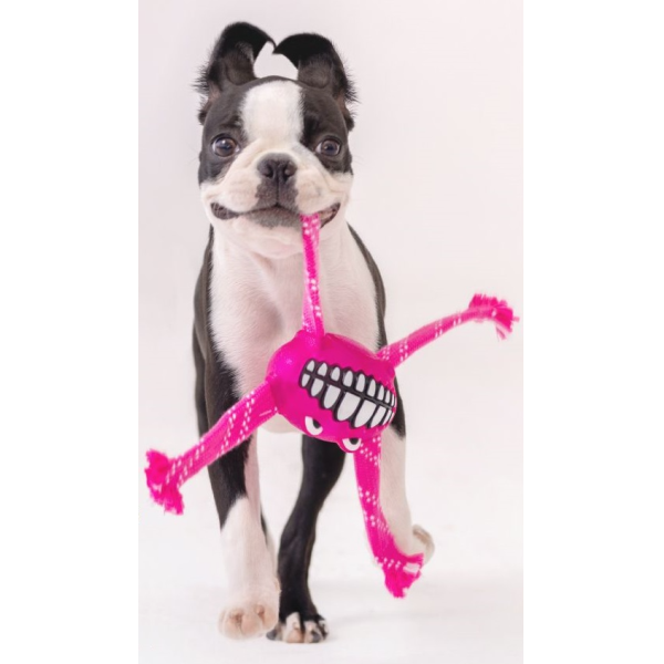 Chyťte ho, zatraste ním a uvidíte rodeo. Odolná pískacia hračka pre psov Rogz Flossy Grinz zaujme v každom ohľade. Vášho psíka poriadne naštartuje a pripraví na parádnu zábavu. Vďaka štyrom tkaným lanám sa hračka ľahko švihá, ľahko hádže a ešte lepšie ťahá. Gumový povrch je príjemný na hryzenie a bonusové priehlbiny pomáhajú čistiť zuby. Uvidíte, že váš pes sa bude usmievať takmer rovnako ako samotný Grinz.