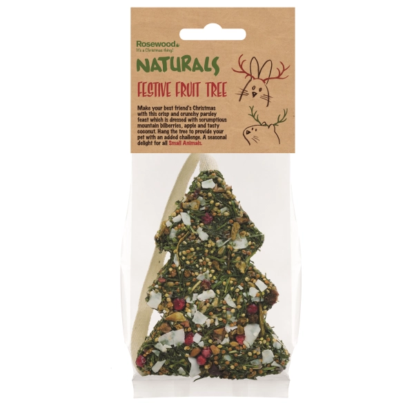 Originálna vianočná hračka na okus pre hlodavce Rosewood. Vianočný stromček obsahuje veľkú porciu chutných a zdravých ingrediencií. Stromček je opatrený bavlnenou šnúrkou pre priviazanie v klietke.