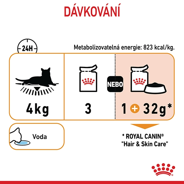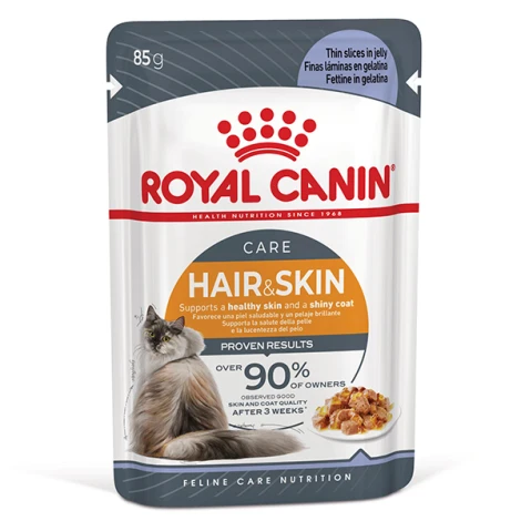 odstrániťVlhké krmivo Royal Canin FCN Hair & Skin v lahodnom želé pre dospelé mačky. Zloženie je vďaka zvýšenému obsahu omega-3 a omega-6 mastných kyselín zamerané na zdravú a krásnu srsť a pružnú kožu.
